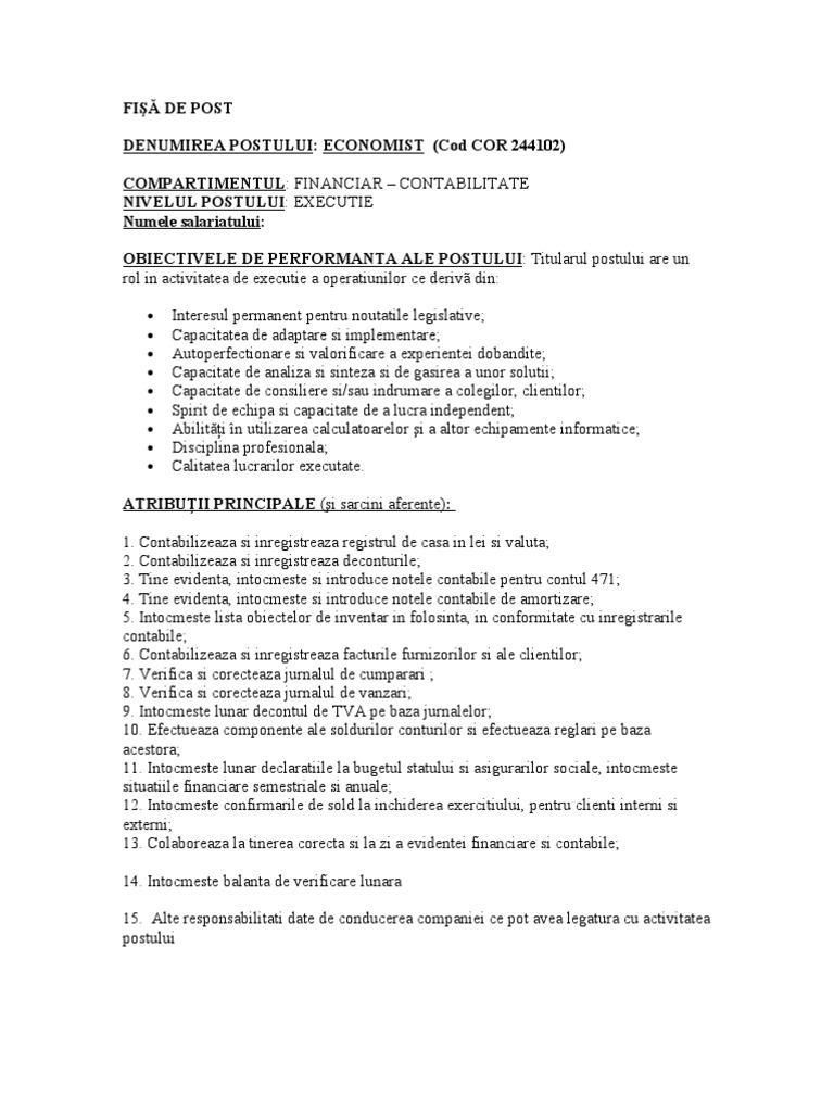 vizitati articolul complet aici : https://es.scribd.com/doc/256302936/Fisa-de-Post-Agent-Comercial-Vanzar1 Pe ce functie/cod cor putem angaja o persoana cu studii superioare, care in mod normal ar fi fost in pozitia de adjunct sef raion?dorim sa gasim o alternativa. Cod cor, asistent logistica, organigrama, nomenclator revisal, lipsa cor revisal, corectie cod cor. 2 (studii medii) asistentii de vanzari in magazine vand o gama de bunuri si servicii direct catre public sau in numele unitatilor de vanzare cu amanuntul si cu ridicata si explica functiile si calitatile acestor bunuri.