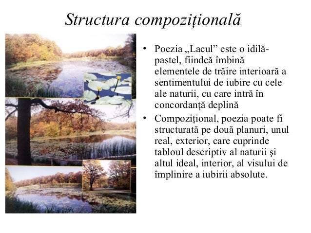 Poezia lacul poezia lacul a fost publicata in 1.09.1876 in revista convorbiri literare.mihai eminescu a fost cel mai mare poet roman lacul nu repr.doar locul de intalnire al indragostitilor,el se constituie in elementul care prin frumusetea sa,prinsonoritatile sale melodice sporeste frumusetea si. Prima strofa a poeziei prezinta o imagine feerica a lacului incarcat cu flori de nufar. Tema poeziei este dorinta arzatoare a indragostitului de implinire a iubirii ce ramane doar un vis neimplinit.